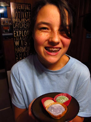 Some mochi jumped into our basket and came home with us. What is mochi? (Hint: click link.) What's mochi like? It's soft. Very much like the apricots we bought recently. Soft like a baby's butt. Soft and powdery. Imagine a fresh clean baby butt covered in fine powdered sugar, now shrink it down to the size of the palm of your hand. That's what a mochi feels like. All similarities, thankfully, end when you bite into one.